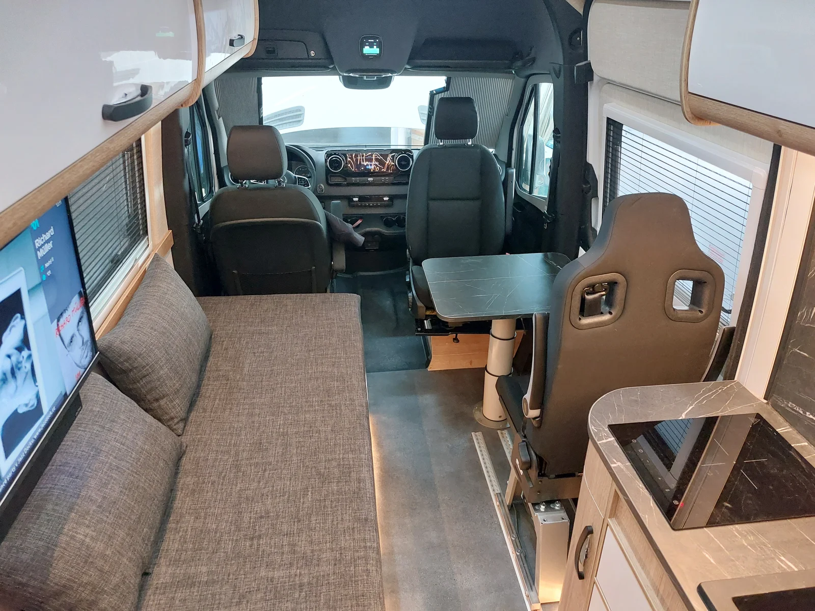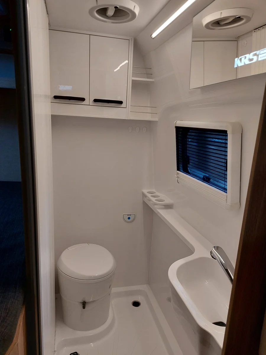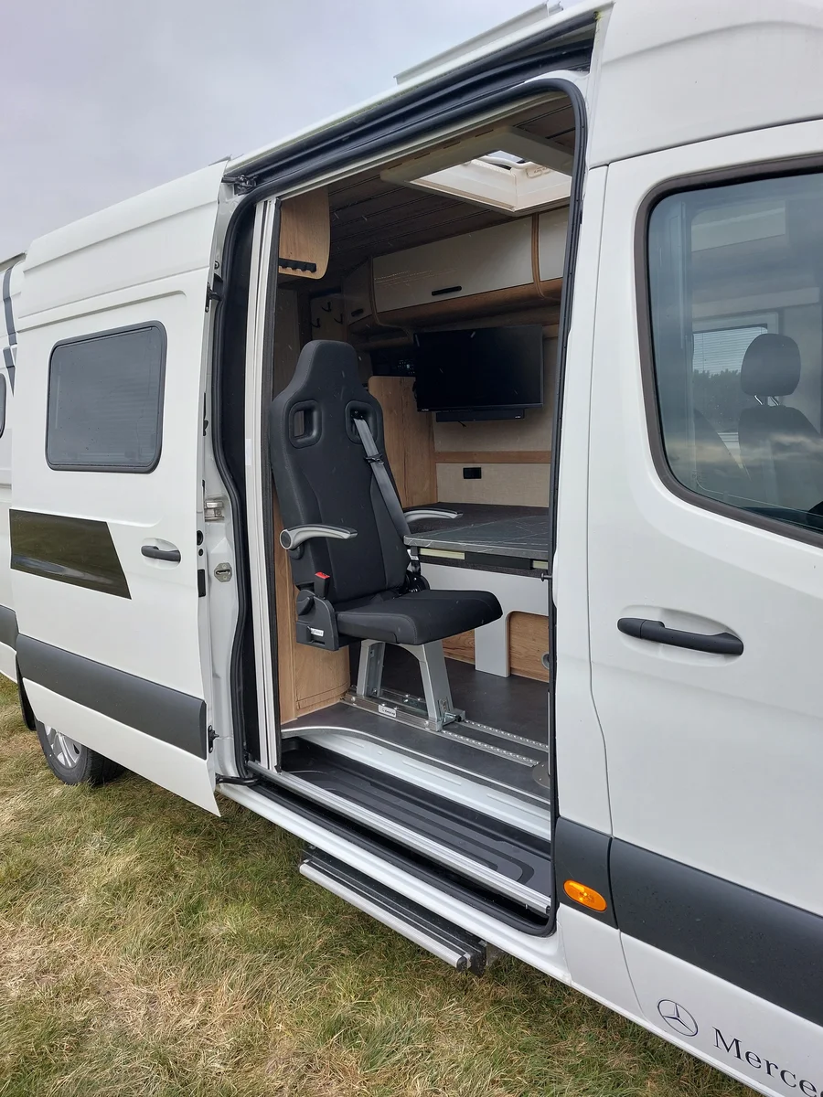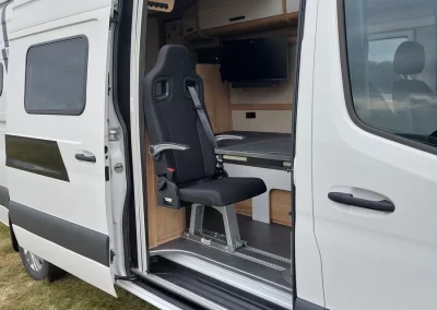 Das KRS Van Class Wohnmobil ist in erster Linie für zwei Reisende (Fahrer + Beifahrer) konzipiert und gedacht und kann optional mit einem dritten, voll verstellbaren, abnehmbaren Sitz ausgestattet werden.