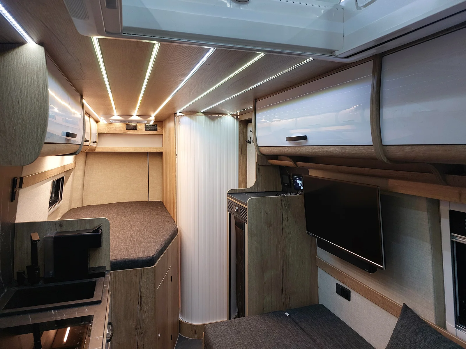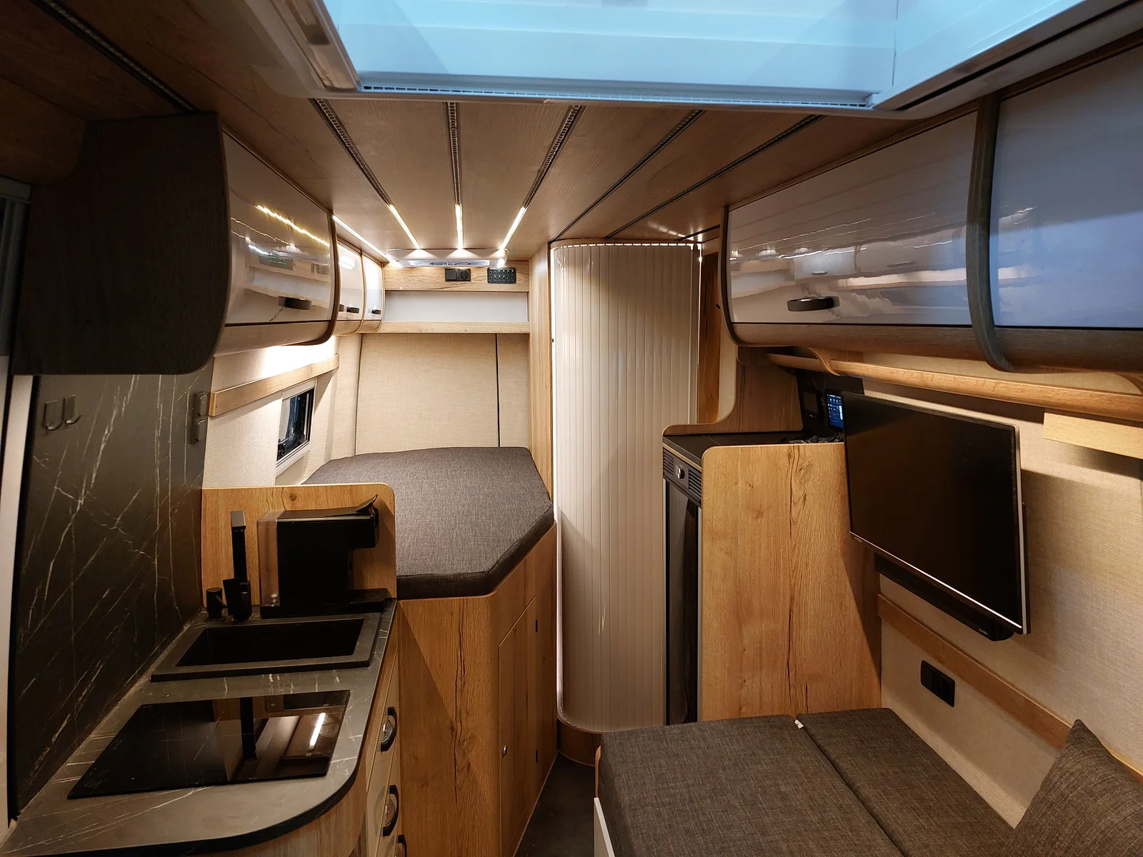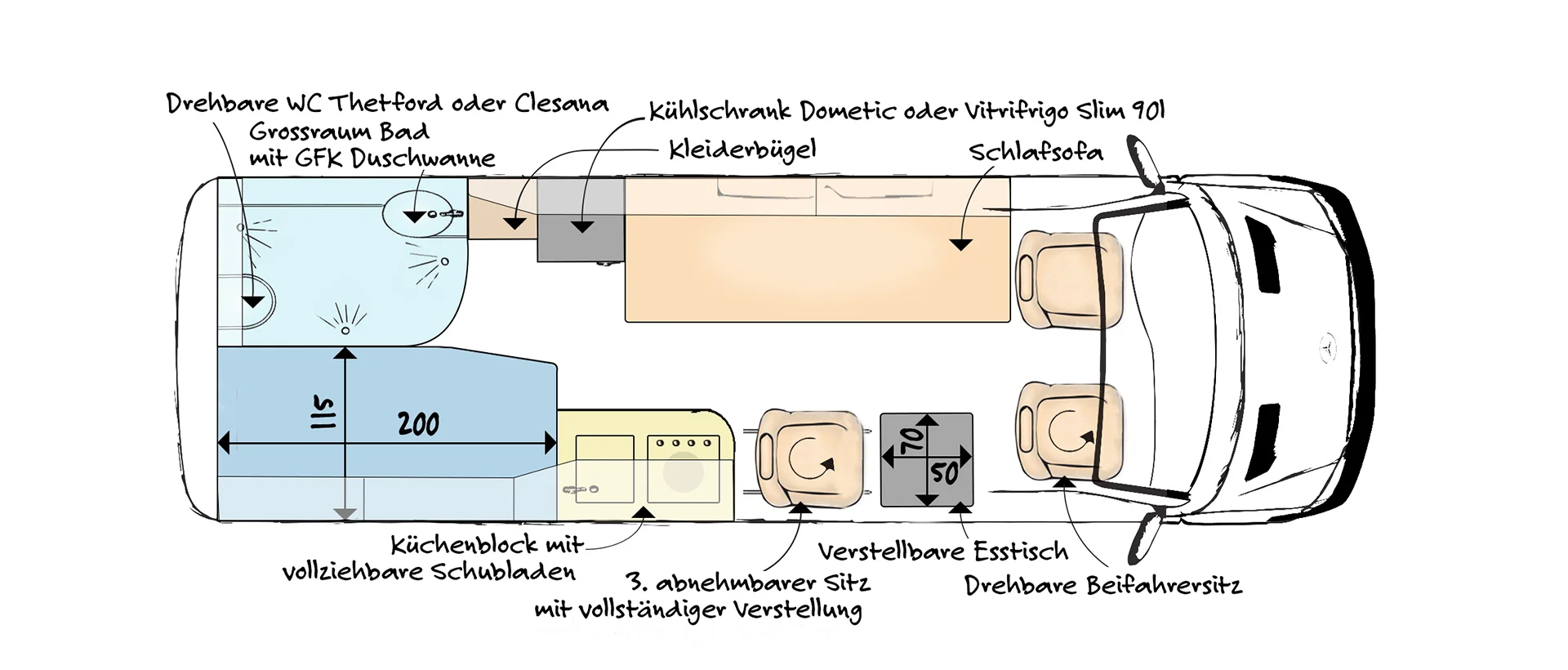 Ausreichend Stauraum in den Unterschränken, eine Küche mit voll ausziehbaren Schubladen, eine große „Garage“ mit den Maßen 200x115x80 Zentimeter, in die auch Fahrräder passen, reichen für die Kapazität und Dokumentation des Fahrzeugs völlig aus.