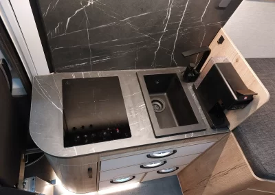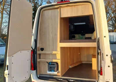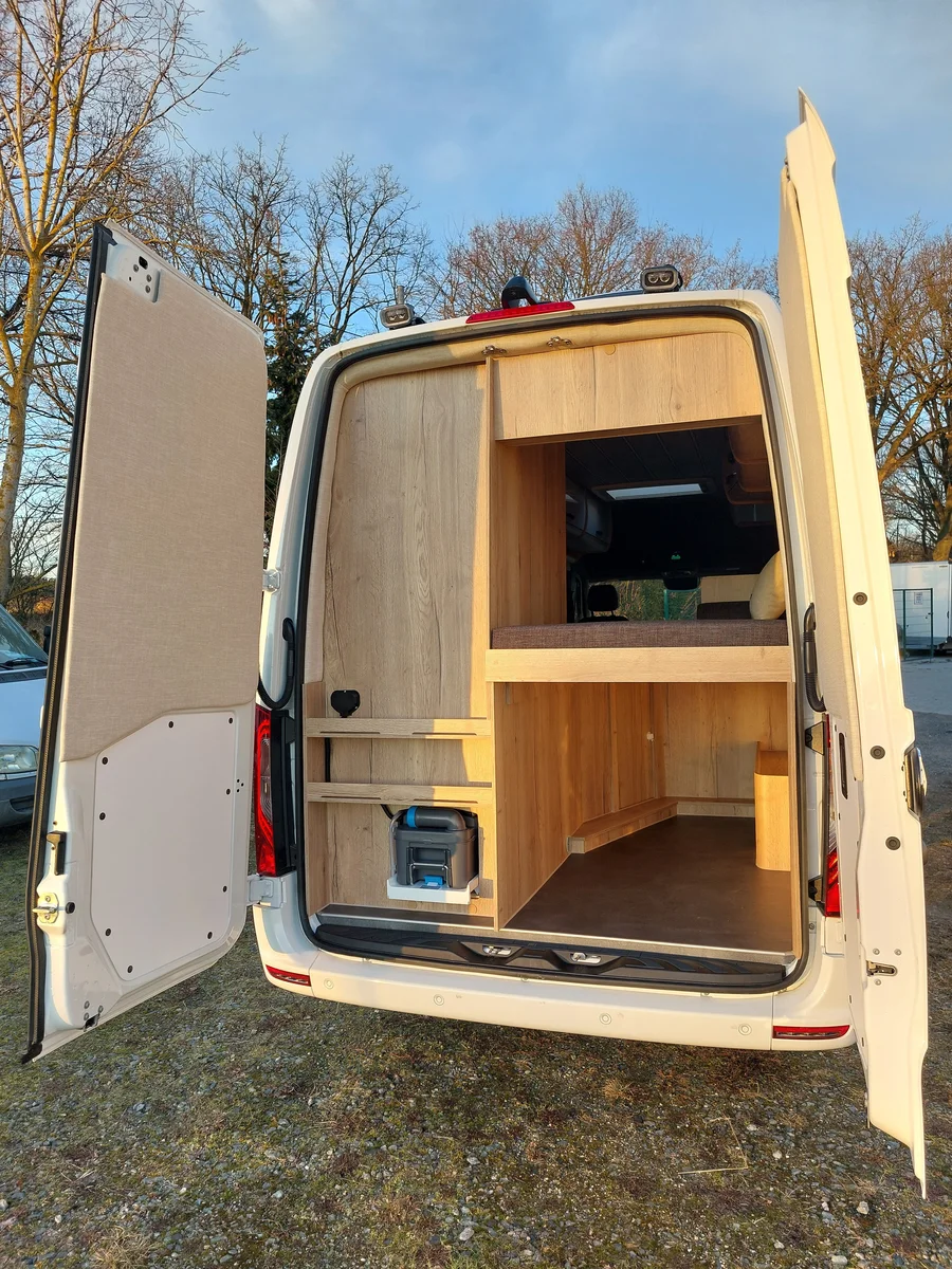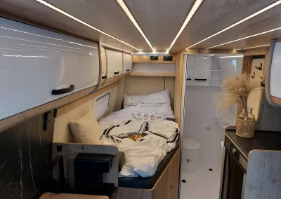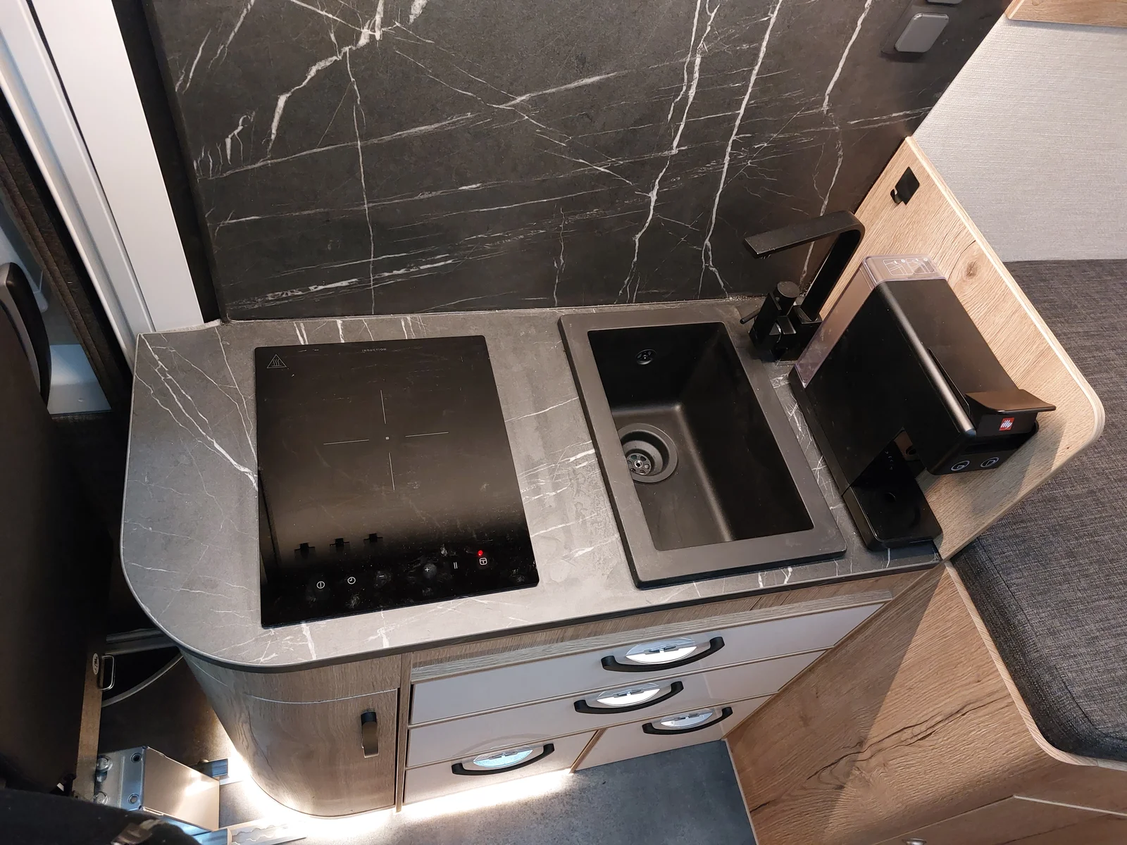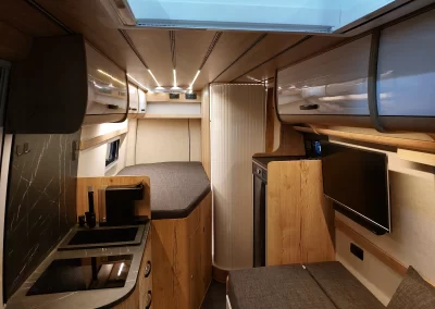 Ausreichend Stauraum in den Unterschränken, eine Küche mit voll ausziehbaren Schubladen, eine große „Garage“ mit den Maßen 200x115x80 Zentimeter, in die auch Fahrräder passen, reichen für die Kapazität und Dokumentation des Fahrzeugs völlig aus.