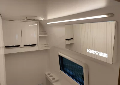 Sämtliche Design- und Funktionsmöbel im Wohnraum sind aus ultraleichtem Sandwichmaterial gefertigt, was nicht nur das Eigengewicht, sondern natürlich auch in zweiter Linie die Kosten einspart, die mit dem Betrieb des KRS-Van-Class-Fahrzeugs verbunden sind.